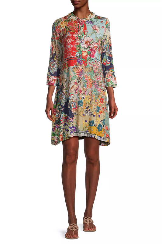 Intricate Floral Collage Decorates Button Shirtdress