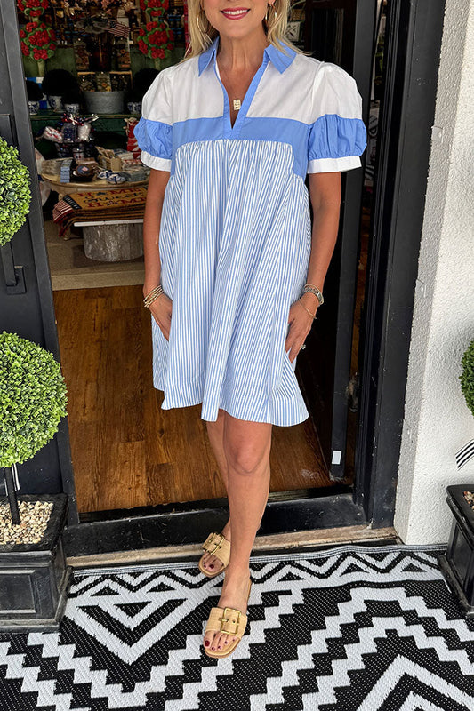 Stripes Trim Puff Sleeve Dress