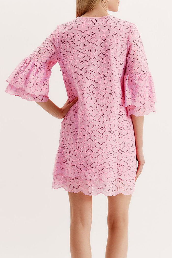 Beautiful and intricate, all over eyelet makes this three-quarter sleeve dress a seasonal favorite. Designed with a double lined scallop hem and bell sleeves for a feminine touch. Style it casually with flat sandals for day, or dress it up with a heel and statement accessories for night!