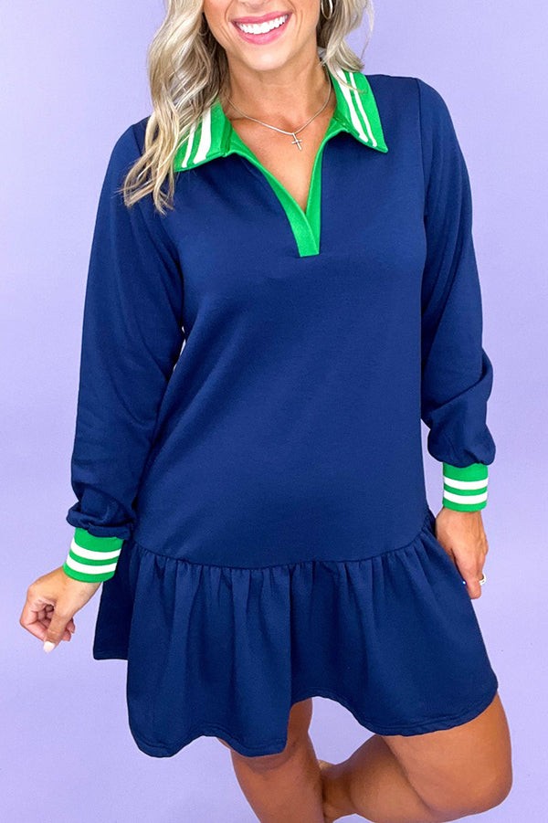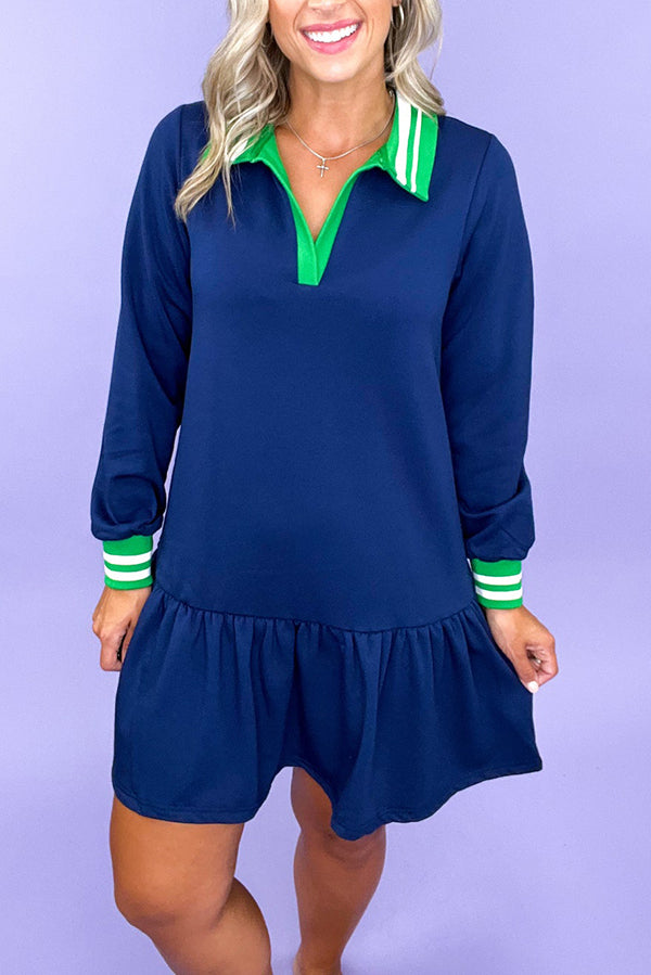 We're glad you've clicked on our new Contrast Trim Ruffles Hem Dress as we're really into its casual vibes! Love this long sleeve Green and Navy dress offering split collar and ruffled hem!