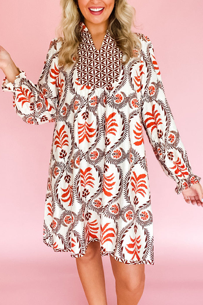 We're glad you've clicked on our new Enough For Me Dress as we're really into its casual vibes! Effortlessly elegant with a touch of whimsy, this printed V-neck dress is all about flow, texture, and detail. Designed with a smocked collar and split neckline, it features a contrasting printed yoke that adds dimension and charm. The long sleeves gather into soft elastic ruffle cuffs for a subtle, feminine finish. Crafted from lightweight woven fabric with beautiful drape, the easy straight fit makes it perfect for days when you want to feel put-together without trying too hard. Just add boots or flats and you’re set.