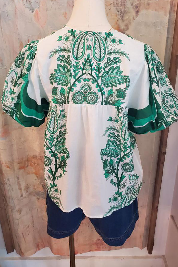 This fabulous green and white puff sleeve top combines classic styling with a bold and beautiful print. The puff sleeve straight body is a favorite due to its ease of wear and comfort. Just add your favorite denim and you are set will a casual and comfortable summer look.