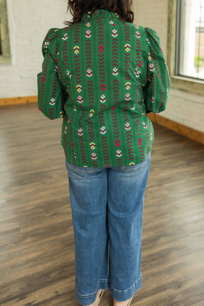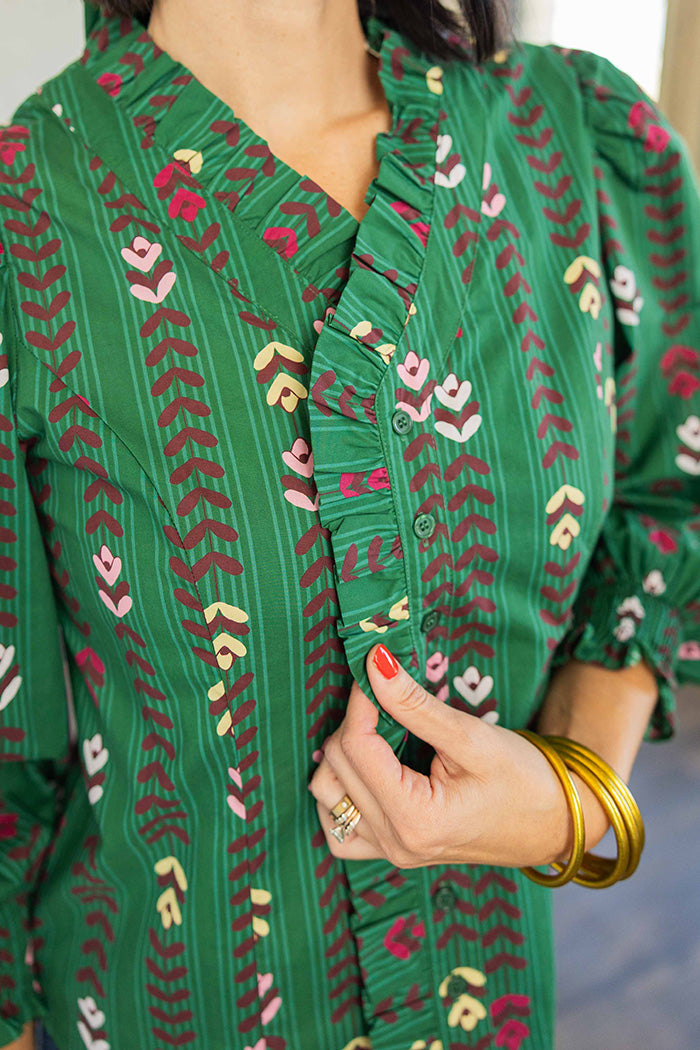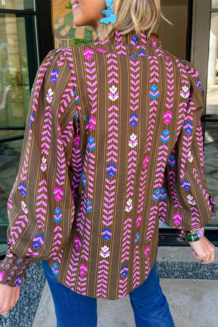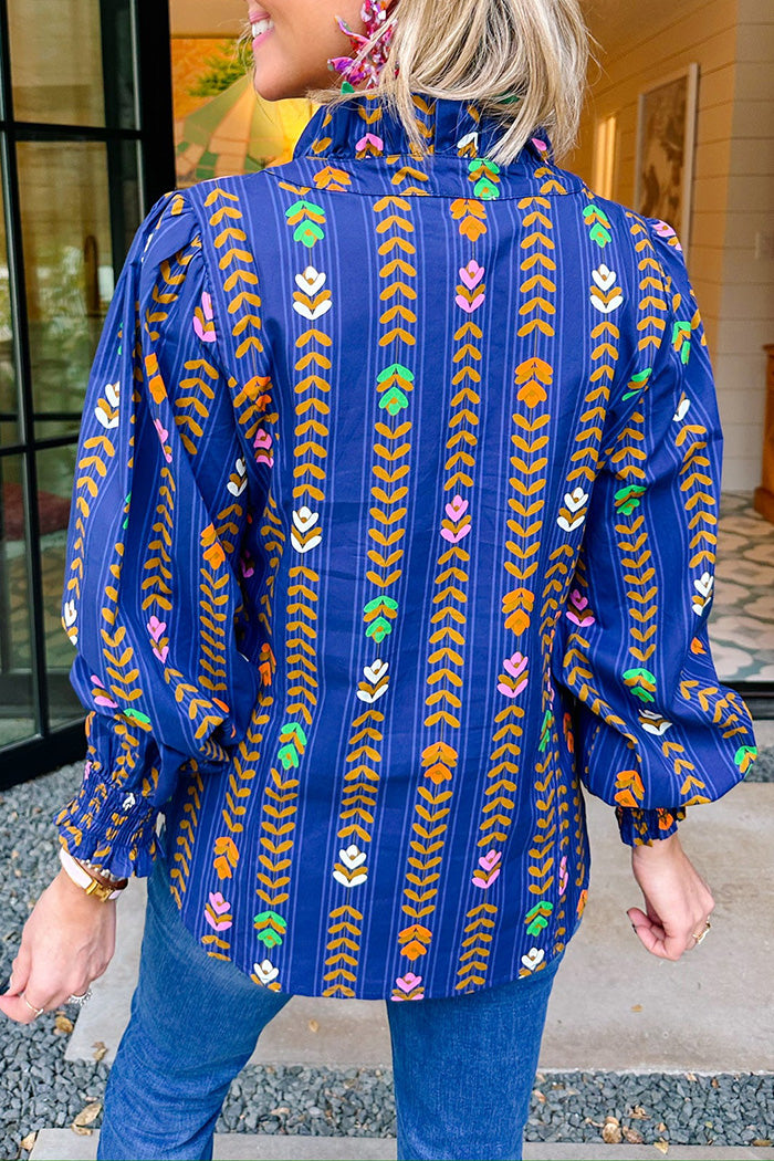 Floral Vine Print Ruffled Smocked Cuff Top