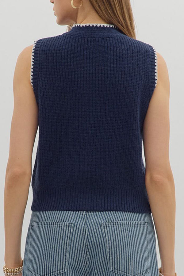 We're glad you've clicked on our new Front Knot Closure Knit Top as we're really into its casual vibes! The Solid sleeveless sweater knit button front knot closure top featuring accent blanket stitch finish details. make this a great choice for any stylish girl.