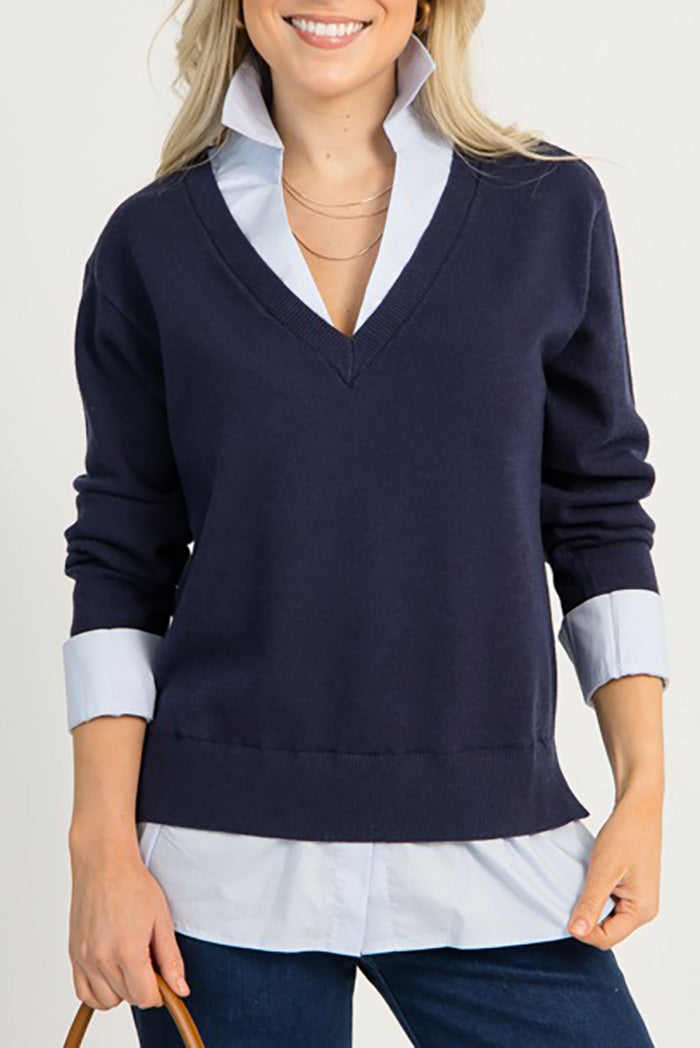 We're glad you've clicked on our new Layered Shirt Collar V-Neck Sweater as we're really into its casual vibes! The unique design make this a great choice for any stylish girl.