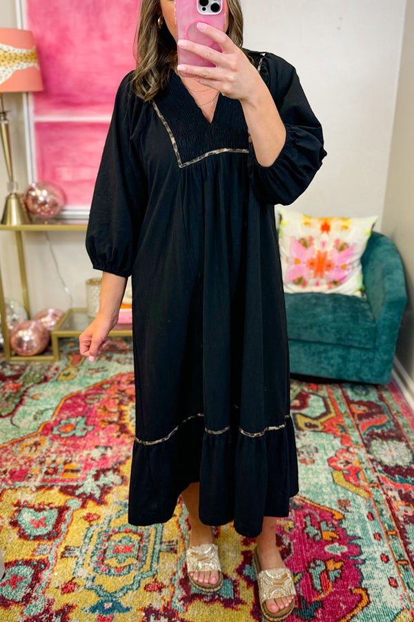 We're glad you've clicked on our new Leopard Patchwork Ruffles Hem Dress as we're really into its casual vibes!Features a cotton material, smocked detailing on the neckline, 3/4 length sleeves with elastic detailing, v-neckline, has a collar, & has the cutest leopard print accents.Â
