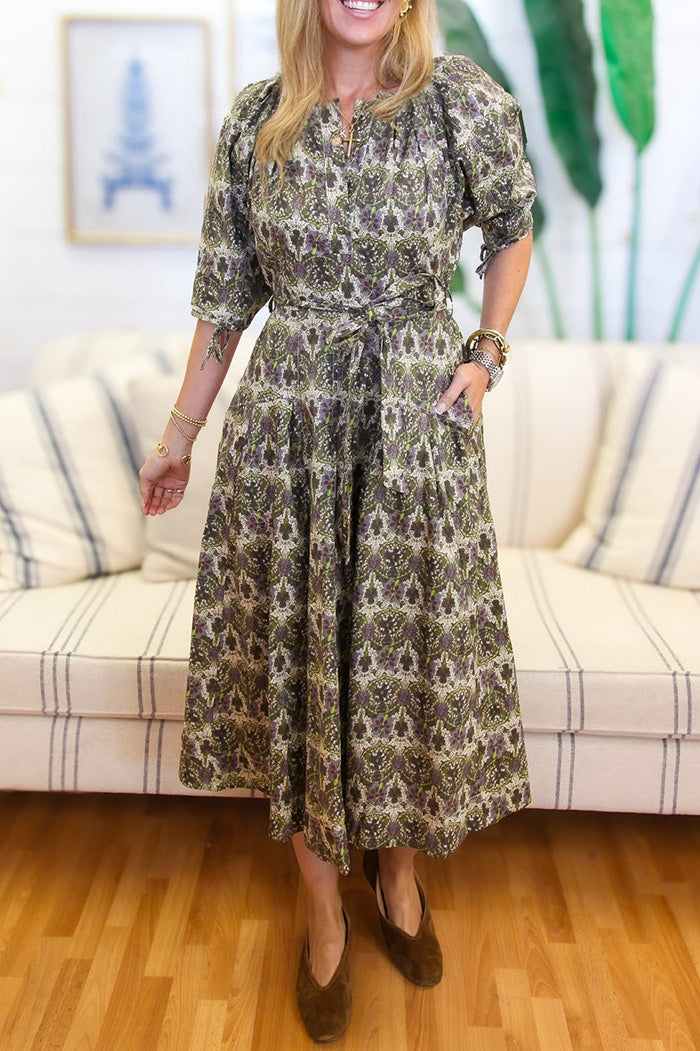 Pocketed Floral Print Belted Puff Sleeve Midi Dress