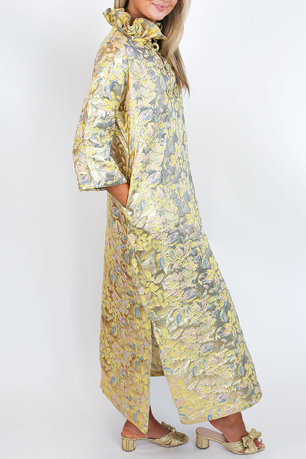 We're glad you've clicked on our new Ruffle Collar Vintage Glam Design Dress as we're really into its casual vibes! Crafted from the most exquisite gold brocade fabric, it features a high ruffle collar, elegant gold frog closures, and a soft pink taffeta lining. With its refined construction and vintage glam design, this Dress is the perfect dress for any special event.